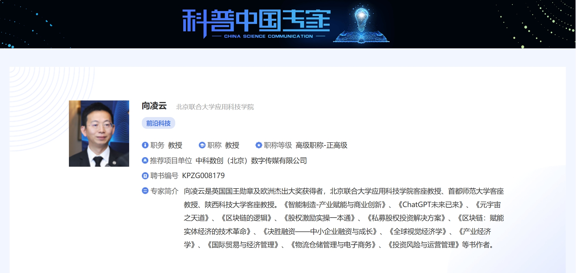 据科普中国专家页面展示,向凌云是英国国王勋章及欧洲杰出大奖获得者,北京联合大学应用科技学院客座教授、首都师范大学客座教授、陕西科技大学客座教授。《智能制造-产业赋能与商业创新》、《ChatGPT未来已来》、《元宇宙之天道》、《区块链的逻辑》、《股权激励实操一本通》、《私募股权投资解决方案》、《区块链:赋能实体经济的技术革命》、《决胜融资——中小企业融资与成长》、《全球视觉经济学》、《产业经济学》、《国际贸易与经济管理》、《物流仓储管理与电子商务》、《投资风险与运营管理》等书作者。