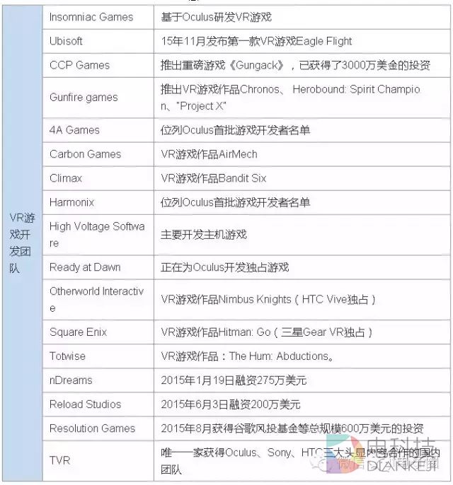▲图4.知名的VR游戏开发团队及其产品和获得融资情况