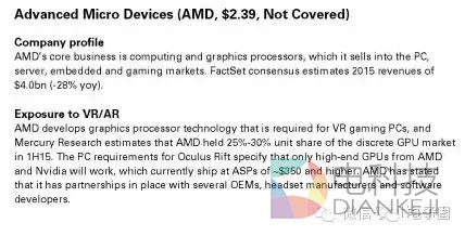 2015年9月,AMD分拆的图形芯片部门Radeon Technologies Group,重点瞄准了游戏和虚拟现实领域的机会。AMD推出了VR解决方案——LiquidVR,LiquidVR技术包含数据锁定、异步着色引擎、多GPU异步渲染等全新功能,能够以更低的延迟来实现更优质的画面,提高VR的沉浸体验。