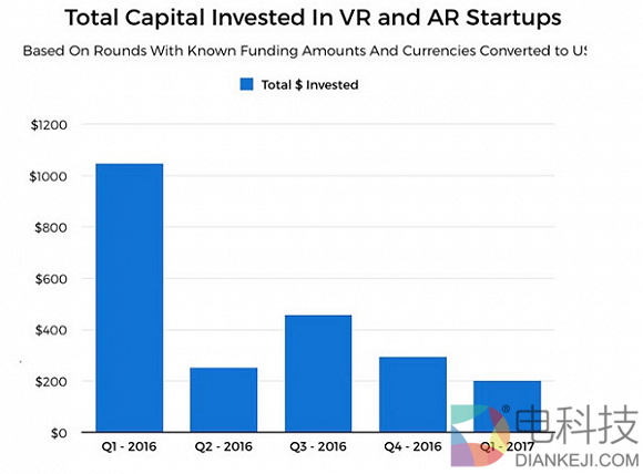 更为严峻的是,VR创投市场开始低迷。市场研究公司Crunchbase的数据报告显示,2017年第一季度,全球VR/AR的风险投资额只有两亿美元,相比去年同期的10亿美元暴跌了80%。VR行业总体呈现降温趋势,而企业融资也没有以前那么容易。