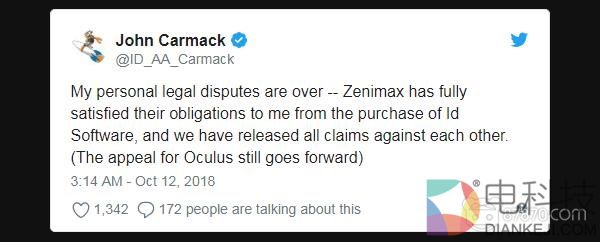 卡马克在Twitter上表示:“我个人的法律纠纷已经结束——Zenimax已经完全向我付清了收购Id Software的款项,我们已经相互取消了所有诉讼(关于Oculus的上诉仍在进行中)。”