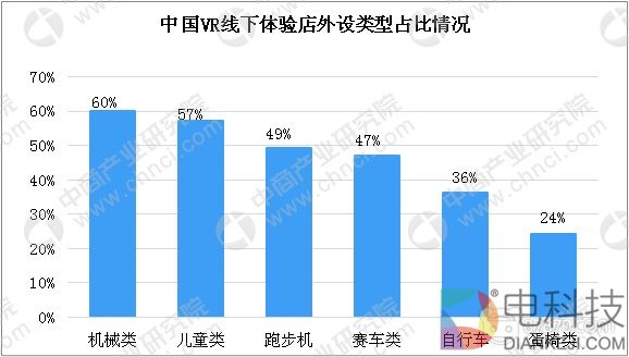 在VR线下体验店外设类型情况方面,目前外设带来的体验和期望是有一定差距的,因此未来VR体验馆会非常倚重外设,枪械类设备比例占比为60%,位居榜首;排名第二的是儿童类,占比为57%;排名第三的是跑步机,比例占比为49%。