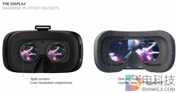 MagiMask是一款AR头戴显示器,专为沉浸式环境中观看电影而设计。从外观及使用方法上来看,MagiMask与三星Gear VR或谷歌Daydream View非常相似,都需要插入iPhone或者安卓智能手机。不过,有趣的是,MagiMask使用一块透镜代替两块分离的立体透镜,从而提供全屏的视觉效果。