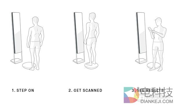 用户需要站在360°旋转秤上旋转15秒,旋转秤能够检测体重及运动情况,然后镜子通过三个英特尔RealSense实感深度传感摄像头进行人体扫描。二者同时工作,捕获近400万个不同的数据点然后快速生成数据,整个过程只需几分钟。