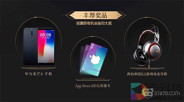 《三国大亨》及《剑道仙语》,作为YY游戏2018年主打产品,更是以创新理念与匠心精神,树立品质标杆,势必在金翎奖的角逐中,取得好成绩。现在参与投票,就有机会获得华为麦芒6手机、苹果AppStore100元充值卡、西伯利亚K11游戏电竞耳机等精彩好礼。