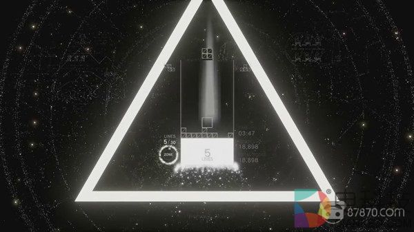 每一次旋转下落,都会奏响BGM的一个音节;每一个音节响起,都会点亮下落方块的轮廓;每一次堆砌消除,都会通过PS4手柄向我们传送精确的震动反馈;每一次震动反馈,都会积攒分数逐条激活BGM的旋律音轨;可想而知,越是熟练的玩家,越能在《俄罗斯方块效应》当中体验到行云流水收放自如的听觉享受——更重要的是,这份享受不仅仅是听觉的福利,视觉同样属于这份体验的核心感官渠道: