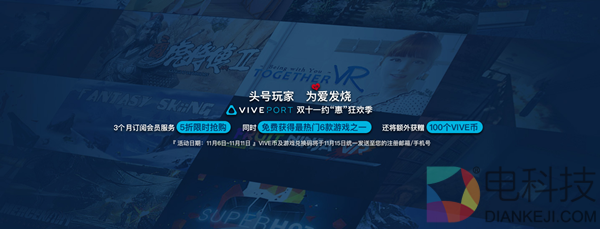 2018年的双11就要来了,11月6日-11月11日,HTC旗下的虚拟现实平台Viveport将举办为期6天的狂欢活动!在此期间订阅3个月的Viveport会员服务,不仅可以享受五折优惠,还可以获赠100个Vive币以及6款热门游戏任意一款。