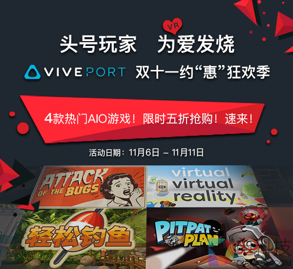 除此之外,VIVEPORT应用商城还为所有VIVE FOCUS用户准备了4款热门游戏的限时5折优惠活动,包括《虫类攻击》、《Virtual Virtual Reality》、《开小差指南》、《轻松钓鱼》都将在双11期间限时优惠。