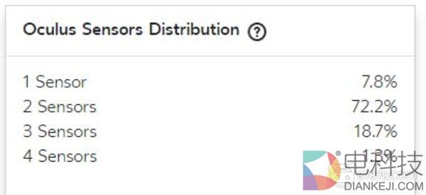 今年早些时候,Oculus在他们的开发者网站上添加了一个名为硬件报告的页面。最近,他们添加了一个新的部分,报告了Rift用户连接到PC的跟踪传感器数量。有趣的是这一数据显示,80%的Rift用户使用2个或者更少的传感器,这意味着只有20%的用户使用了需要3个或者4个跟踪传感器的房间规模的跟踪功能。(原文)