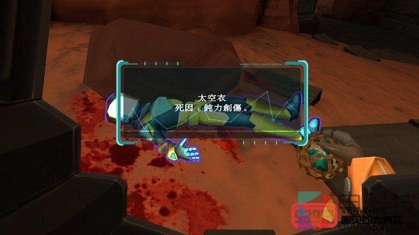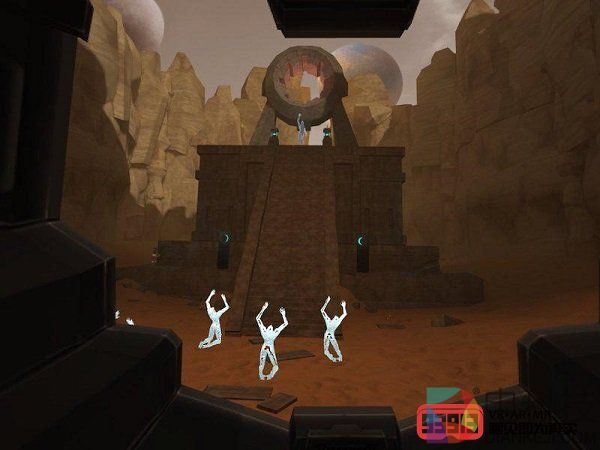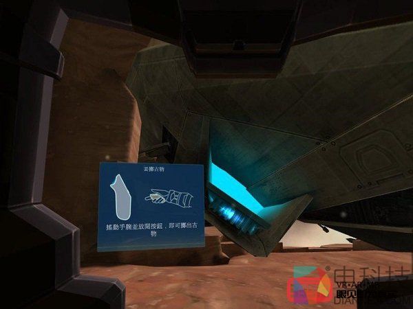 沿着道路前进,走到一处山口,此时看到远处一座巨塔慢慢崛起,然后顶了个球(本作似乎主要与球有关),而我的冒险也由此正式开启。根据这一画面,我猜想此行的目的地应该就是这座巨塔。说到这里顺便还要介绍一下游戏的移动方式,玩家面前的画面周围会有一个不规则的边框,这大概是游戏中主角佩戴的头盔(毕竟是在外星球还是戴个头盔比较安全),而本作的移动方式是通过手柄触摸板进行平移,而非一些VR游戏采用的瞬移。当我操作角色进行平移时,面前的头盔也会随之缩小(即很多VR游戏平移采用的“缩圈”),这种设计显然是为了减弱玩家平移时的眩晕感,而这种移动方式无论是对于操作还是体验来说也都更加顺畅。
