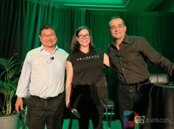 从左到右:GamesBeat的Dean Takahashi,Skydance的Amy Allison和三星的Farsh Fallah。
