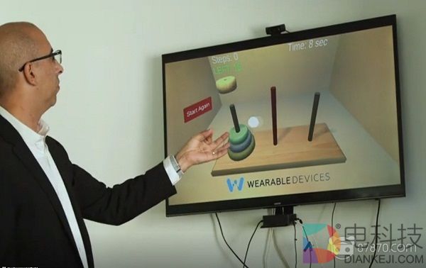 Wearable Devices首席执行官兼联合创始人Asher Dahan演示了一款移动端手机游戏。体验者看到光标跟随Dahan的手指移动,通过上下移动左手以及捏放食指与拇指,Dahan能够精准地将一个个圆圈捡起或套在杆子上。
