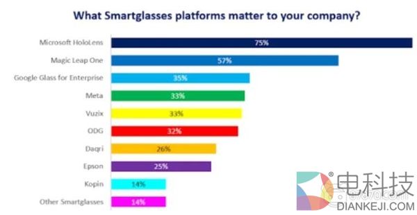 迄今为止,智能眼镜一直是企业关注的焦点,75%的公司表示HoloLens对他们专注的智能眼镜的业务至关重要。2018年Q3发布的Magic Leap One(57%)在市场上也拥有很高的影响力,尽管它目前不是面向终端用户的产品。Google Glass for Enterprise(35%)、Vuzix(33%)、Meta(33%)和ODG(32%)在市场规模上大致相似,其次是Daqri(26%)、Epson(25%)和Kopin(14%)。报告中提及的其他平台包括RealWear、Mira、Leap Motion North Star以及传言中但尚未证实的Apple智能眼镜。如果苹果进入市场,这种分布如何变化将会很有趣。
