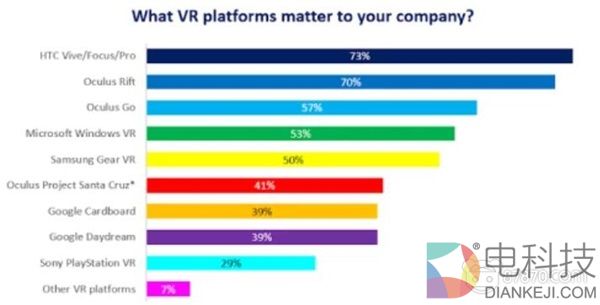 VR公司主要关注的平台是HTC Vive / Focus / Pro(73%)和Oculus Rift(70%)。其次是Oculus Go(57%),Microsoft Windows VR(53%),Samsung Gear VR(50%)。Oculus Quest(原Oculus Project Santa Cruz)直到大部分调查问卷被回复后才正式发布。但即使在这种状况下,已经有41%的受访者在关注该平台。鉴于行业对在Oculus Connect 5上发布的Oculus Quest的反应,Oculus Quest在随后调查中的关注指数可能显著提高。Google Cardboard和更高级的Google Daydream的关注度也达到了39%。