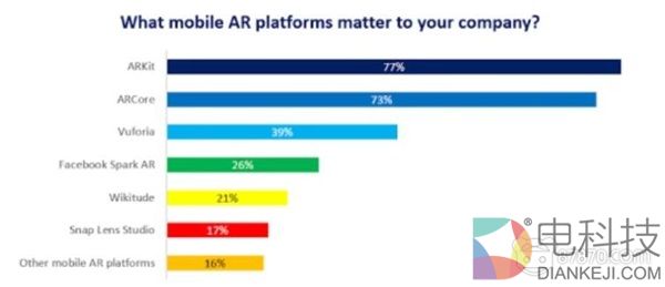 移动AR公司同样关注ARKit(77%)和ARCore(73%),再次展示了市场的跨平台性质。Vuforia(39%)领先于Facebook Spark AR(26%)、Snap Lens Studio(17%)以及Wikitude(21%)的移动AR社交平台。在16%的其他平台(其中一些提供定制化解决方案)中,6D.ai、8th Wall、Unity和一些企业内部的移动AR平台表现强势。苹果和谷歌表现十分强劲,在移动AR领域占据了统治地位,其他平台需要明确的差异点才能茁壮成长。
