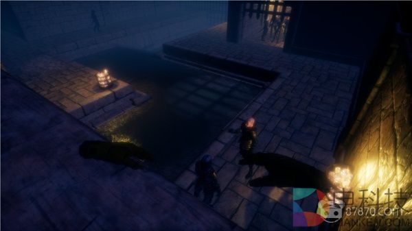 其次,我们可以用水箭(与精灵宝可梦里的某只PM无关)将两位丘八背后的蜡烛弄熄,随后黑灯瞎火之际要偷要剐就看我们心情了——没错,在《潜行骑士》当中,光源固然是我们的头号宿敌,但我们也不是只能绕着灯台摸黑走的善种,烛火通明?一根水箭就能解决大部分问题——我相信,诸位老玩家看到这个设定脸上准保都要笑出花来——这不就是老《神偷》的经典设计嘛,没错,《潜行骑士》的制作组真的很懂!