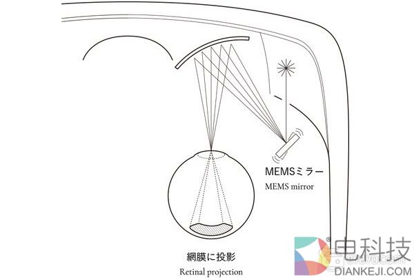 视网膜投影以MEMS镜反射半导体激光器发出的RGB三原色激光,再通过反射板使光会聚在瞳孔近旁,并最终照射到视网膜上。