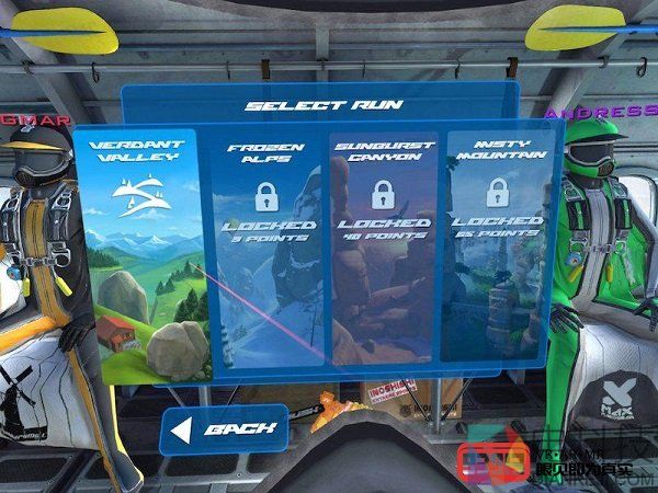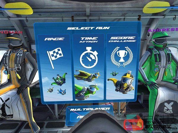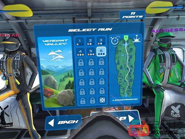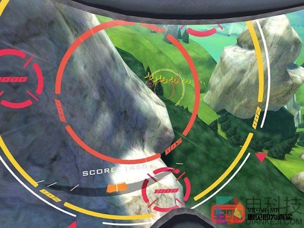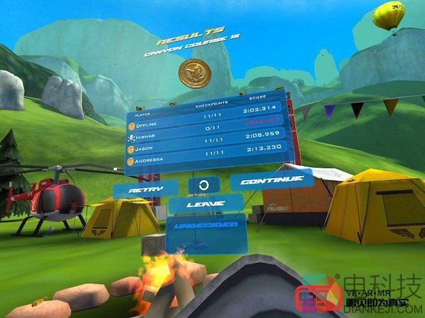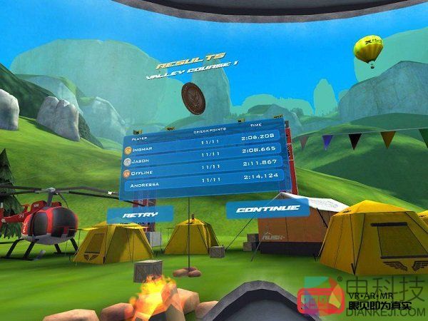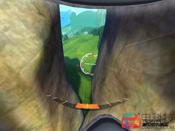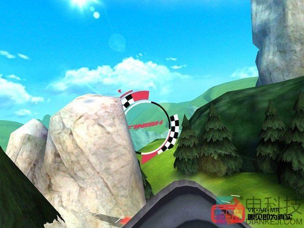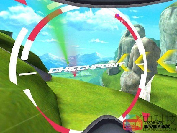 随着倒计时和出发的信号,我和其余三名NPC选手已经飞行在空中。话说回来,第一次用VR玩这种飞行模拟游戏,我心里一方面很兴奋,一方面也很紧张。游戏的基本玩法是沿着比赛路线向下飞行,而途中会有多个checkpoint,玩家需要按照顺序穿过一个又一个checkpoint,同时注意不要撞在山崖或地面上,不然就会game over。