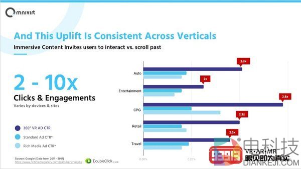 性能的提升在所有行业和用例中都是一致的。在所有行业中,与其通常运行的2D广告相比,同一客户和广告系列的沉浸式广告将获得更高的性能。Universal Pictures,Travel Nevada,Clorox,Cathay Pacific,Home Depot和Disney Broadway等客户都推出了多个VR广告活动。