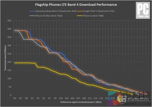 高通的基带一直是其最出色的产品,苹果与高通的纠纷导致苹果转投了英特尔的怀抱,直接的后果就是今年新一代iPhone Xs、XR与Xs Max都出现了手机信号下降的问题,虽然天线设计也要背一部分锅,基带上的差距也是实际存在的。PCMAG的一张图片显示了高通与英特尔基带的差异,使用高通基带的手机在同样信号强度下确实有着较高的下载速度,即使领先并不明显。