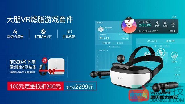 在12.12来临之际,大朋VR京东官方旗舰店为消费者带来新品钜惠。12.12日当天预订全新大朋VR燃脂游戏套件,即可享受100元定金抵扣300元的优惠;前300名下单还将获赠燃脂体测装备。