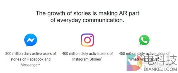 目前最流行的AR应用形式包括在旅途中扫描和翻译文本的应用程序,或者是Pokemon Go这样让人们在社区周围追逐虚拟精灵的应用。我们越来越多地看到人们通过移动设备使用AR,例如Instagram Stories。Facebook旗下的所有手机应用程序中用户每天分享超过10亿个故事。从面部滤镜到有趣的动画,人们正在使用这种格式创建和分享独特的时刻。