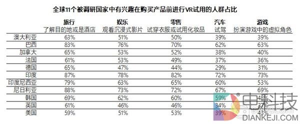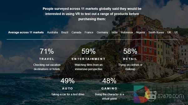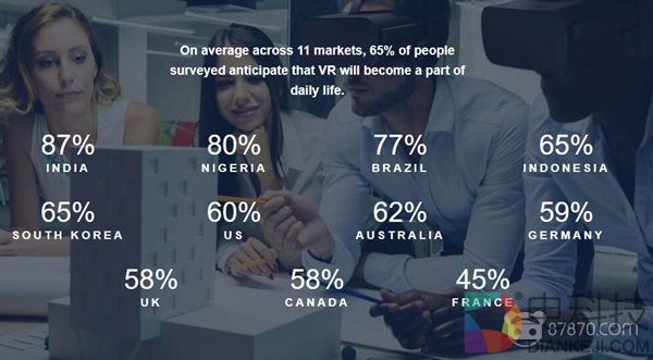 虽然本次调研涉及虚拟和增强现实主题,但受访者对VR的兴趣比AR更具体。在所有11个国家中,65%的受访用户预计VR将成为日常生活的一部分,其中印度用户的支持率最高,达到87%,而美国为60%,法国为45%。同样,63%的用户表示他们希望使用VR进行预购产品测试,这显然是调查中最强大的VR用例