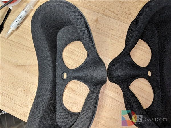 Oculus Go的外壳采用ABS塑料制成,与面部的贴合处以及头带则使用了多种合成材料。Oculus Go原本的颜色是一种不错的主流灰色,可以很好的隐藏注塑成型过程中的微小缺陷。但帕胖本人更喜欢黑色的VR头显,所以他首先进行的就是颜色改造。