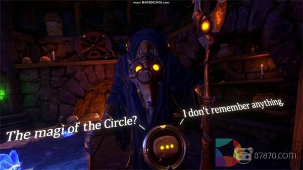 房间里有两个NPC,一个法师装扮的皮甲异形和一个站在桌子上的哥布林。进入房间后,皮甲异形主动跟玩家说话,玩家需选择漂浮皮甲异形面前的省略号进行对话。