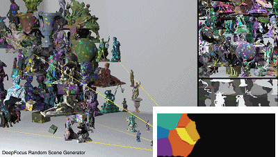 由此产生的对象集合令人眼花缭乱,但这是一种可以解决随机场景生成器视觉问题的疯狂方法。这种不自然且丰富的几何形状和遮挡物具有比现实生活中更多种类的纹理、表面和其他特征,可以作为DeepFocus深度学习系统的一个焦点分析训练营,让DeepFocus能够为它未见过的VR体验渲染模糊效果。
