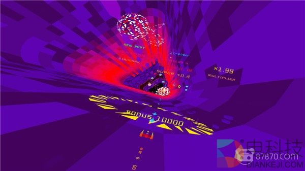 简单来说,这款VR版的《POLYBIUS》在形式上和雅达利时期那些大受欢迎的隧道射击游戏并没有太大区别——流光溢彩的背景中,我们驾驶着一艘造型简洁的飞船沿着“隧道”向前飞驰,不断击落前来阻碍的敌人,利用掉落的道具增强机体从而飞得更快更远——以上所有一切都发生在色彩饱和度极高不断闪耀犹如霓虹灯的背景下,再加上80年代复古风格的电子乐BGM,《POLYBIUS》确实能带给我们前所未见的迷幻新感受。