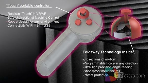 总部位于瑞士的Foldaway Haptics正在开发一个带有力反馈的触觉操纵杆。令人印象深刻的设备可以向任何方向推回手指,可以以一个合理的成本为VR控制