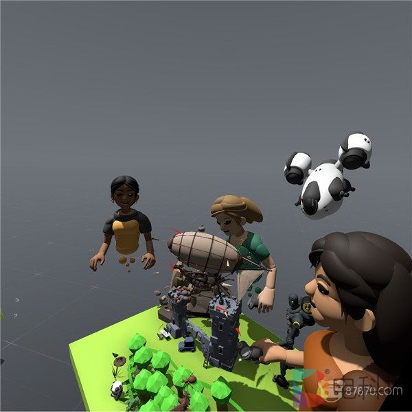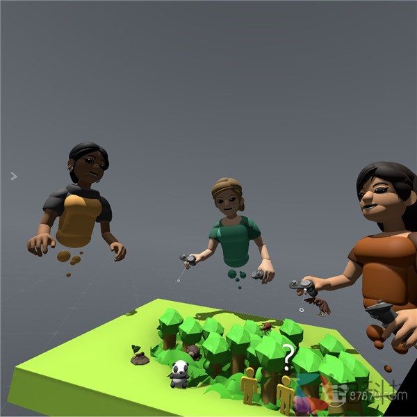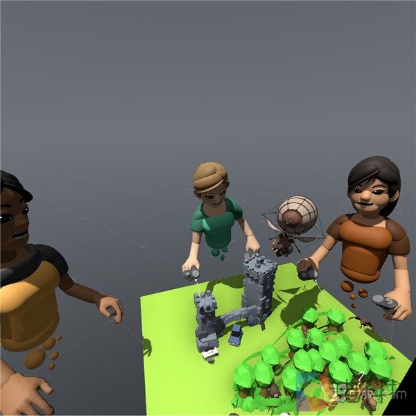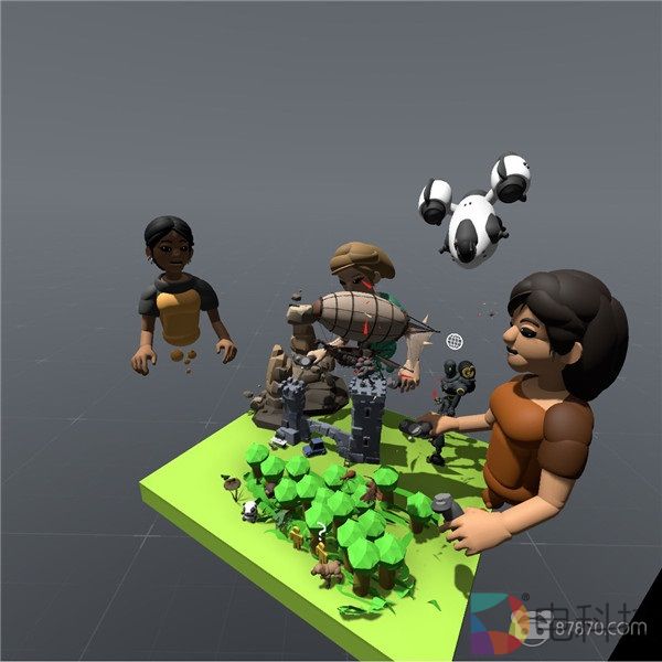 和《Tilt Brush》类似,《Maquette》同样采用了“左手手持UI,右手执行操作”的基本模式;至于具体操作,标准3D建模软件的“拖拽模型节点拉伸/变形”在这里一样奏效,只不过这次我们可以用体感手柄直接进行互动,直观性有了明显提升;值得一提的是,诸如绑定、复制乃至涂色一类看似不算简单的操作,只要拿起Vive Wands手柄实际尝试一番,马上就能发现并没有想象中那么复杂——虽然这种VR版3D建模工具不能用键盘没有热键可用确实影响了工作效率,但换个角度来看,上手学习的难度确实也变得容易了许多,整体而言还是不亏。