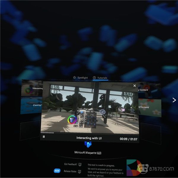 虽然名义上是一款面向B端的专业工具,但和《Tilt Brush》乃至《Block》相比,《Maquette》在“上手学习难度”方面的表现明显要出色太多——戴上头显启动软件之后,在《Maquette》的开始界面当中,我们可以看到许多操作步骤都以示例短片的形式放在了“Tutorials”标签之下;虽然没有字幕说明是个遗憾,但认真看几遍总能理解个大概。总之,一番入门学习之后(通常不会超过15分钟),我们马上就可以进入实操环节了。
