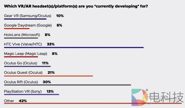 此外,21%的VR / AR开发人员表示他们正在研究尚未发布的Oculus Quest。400美元Quest的开发者工具包不能公开发布,所以它是独立VR系统推出前的一个值得注意的展示。此外,42%的VR / AR开发人员也选择了“其他”类别。