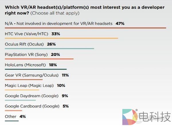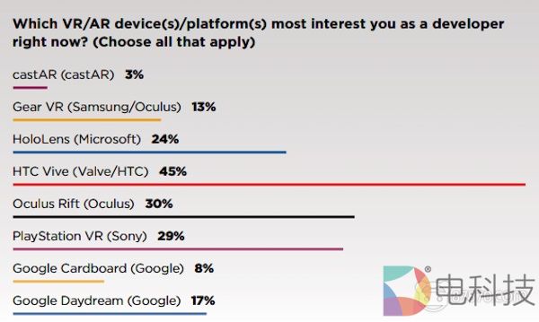 查看去年的GDC报告,HTC Vive仍然为开发者最感兴趣的硬件。在今年的调查中,通过“你现在在为哪个平台开发游戏?”这个问题,我们看到33%的VR / AR开发人员选择Valve / HTC,其次是Rift,为30%。