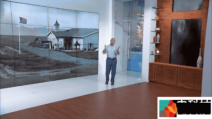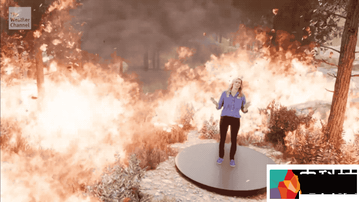 这是 TWC 引以为傲的节目形式,利用 AR 和 MR 的结合来制造出逼真的场景。配合主持人精彩的讲解,观众仿佛置身于恶劣天气的中央。这样的视听效果和普通天气播报完全不同,不仅不无聊,反而像游戏、电影一样扣人心弦,而这背后都是 TWC 团队的科技创新。