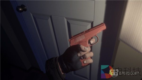 不错,和许多“密室逃脱”主题的VR作品类似,这间不大的公寓当中有许多盆盆罐罐箱子柜子可以让我们上手搜刮,不过遗憾的是,一番搜索下来,大多数容器都是空空如也。不过,尽管翻箱倒柜的收获不大,但我们确实找到了不少看上去很好玩的小玩意儿——装在处方药小瓶子里的镇痛剂,看似能作用于牛排五花肉以外的剁肉刀,以及一把能扣下扳机射出塑料子弹的玩具枪——甚至连上膛和换弹夹的动作都做得有模有样,当然,指望用这玩意儿来对抗气球以外的来犯之敌自然是不现实的,让我们继续找找看。