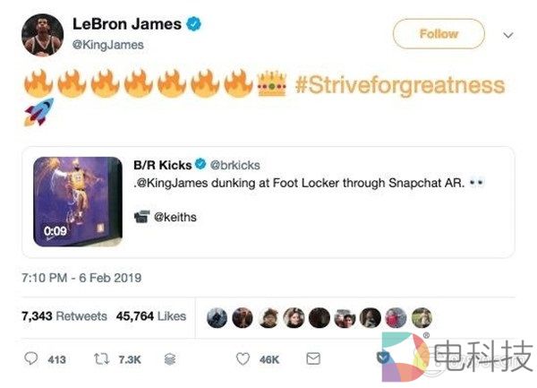 据Snap发言人称,詹姆斯通过Twitter分享了一段关于AR体验的视频,通过他的推文这段短视频获得了超过125万的观看次数。