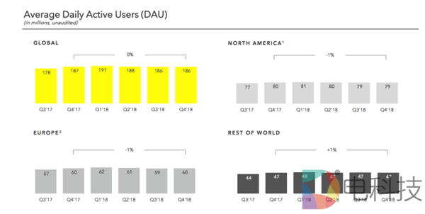 经历了前三个季度的惨淡之后,Snapchat在第四季度的财报中止住了用户数的下滑,其四季度的DAU为1.86亿。在2018年一季度达到1.91亿的日活巅峰之后,Snapchat的日活用户在二季度降至1.88亿,并在三季度降至1.86亿。