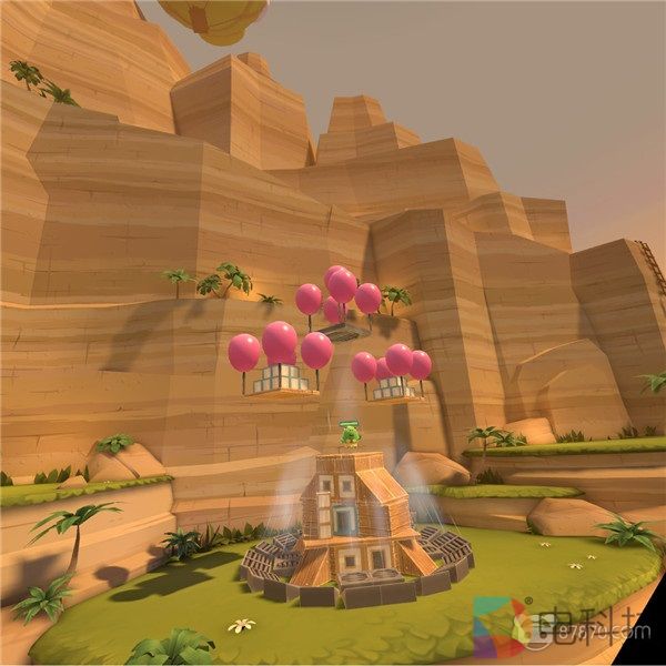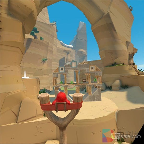 不过,和手机平台上的2D原版不同,《愤怒的小鸟VR》是一部完全3D化的全新作品,并且对VR系统空间追踪机能的充分应用更让我们可以戴上头显迈开脚步四处观察,从各个方向对“城寨”的结构弱点进行瞄准射击——事实上,这也正是《愤怒的小鸟VR》最核心的内容主题:倘若诸位曾经在童年时尝试过“弹弓VS积木”的“攻城大战”,那么恭喜大家,我们儿时的旧梦如今彻底复苏了。