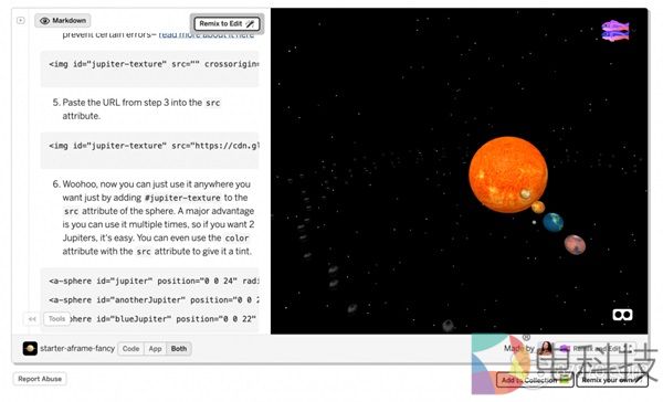 Mozilla今天在一篇博客文章中解释说:“我们希望这个入门套件能够鼓励那些一直在创建虚拟现实体验的人来使用。” 为此,交互式代码示例将在Glitch的网站上提供,并提供逐步说明和查看窗口,使开发人员能够查看代码如何通过调整来改变VR的输出。网站上提供了一个示例允许用户使用太阳系中行星的纹理,使用简单的HTML代码添加和编辑星球。