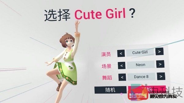 说起来《Dance.VR》的内容其实非常简单,启动应用之后,首先进入选择界面,在这里选择演员(小姐姐)、场景和舞蹈。值得一提的是,这款应用提供了11个小姐姐、9个场景和12个舞蹈供用户选择观看,其体量作为一款移动VR应用还是比较丰富的。在逐项(或随机)选择之后,激动人心的一幕就要开始啦!