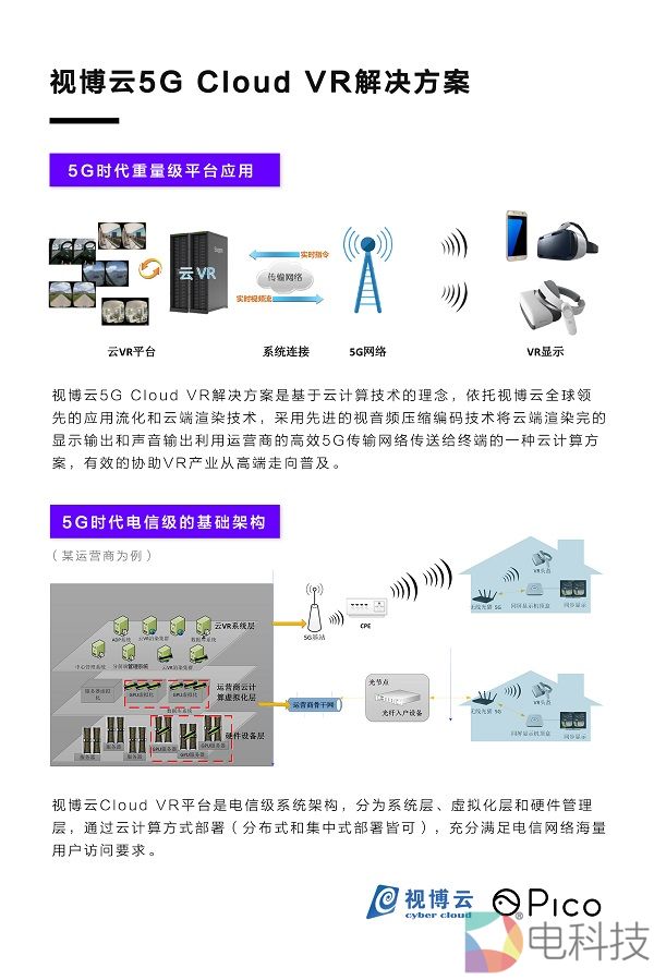 此次跟Pico联合展示的5G CloudVR解决方案引起了业内人士的高度关注。随着5G技术的推进,VR迎来了新的机遇,而云VR的到来,缓解了传统VR硬件终端超强的运算压力,为VR普及提供了可能。5G CloudVR解决方案是利用运营商的高效5G传输网络实现了VR运行能力由终端向云端的转移,有效的协助VR产业从高端走向普及。视博云作为5G CloudVR解决方案的核心技术提供商,从平台底层提供了云VR所需的VR云、VR流化、VR终端时延优化、VR同屏分享等基础技术,从VR内容运行时环境、VR流化传输优化到VR终端体验的提升进行了大量研究工作。2017年9月建设了全球首个广电运营商云VR的商用平台-大连天途云VR平台,2018年7月建设了全球首个电信运营商级云VR的商用平台-福建移动云VR平台的试点,为运营商云VR解决方案的商业落地打下了坚实的基础。