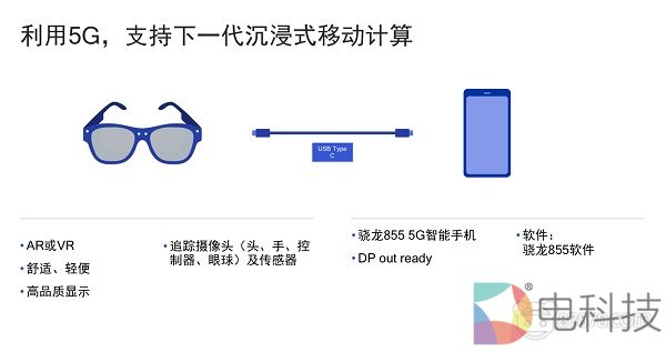 接下来讲讲第二方面,面向5G智能手机的XR头显。这一计划的理念是通过充分利用高性能且支持5G的骁龙855移动平台,实现沉浸式移动计算体验。实现这一理念的方式是将搭载骁龙855的手机通过USB Type-C接口与AR/VR头显连接,与之相连的AR/VR头显具有高清显示屏,舒适且轻便,同时也配备追踪摄像头。同时,Qualcomm也提供兼容性和性能认证,我们正在酝酿一个名为“Snapdragon XR Optimized”(骁龙XR优化)的徽章标识,用以认证基于骁龙移动平台的终端与AR/VR头显可以适配并能达到一定的性能标准。