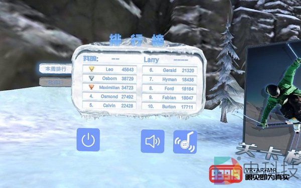 在主界面的左侧,我看到有一个排行榜,其中又包括本周排行和总排行。作为一款体育游戏,提供一个联网更新的排行榜确实非常必要,来自全球的玩家可以在此一较高下并挑战更高的记录,想来就是一件令人兴奋的事情。在排行榜的下方,本作还提供了简单的设置功能,方便玩家获得最佳的游戏体验。在主界面的右侧,我看到还有一个简单的操作教学图示,再次提醒玩家如何进行操作。说完这些,下面就是令人激动的VR滑雪了,冲鸭!