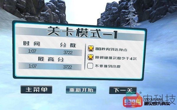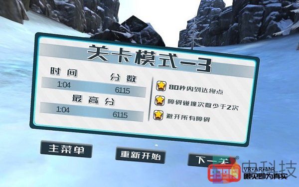 作为一名硬核玩家,我首先选择了经典模式,看看我是会在游戏中撞死,还是在现实中累死。初次上手,我感觉本作颇有一些难度,主要表现在如何将手部与头部的动作进行结合、如何躲避障碍物以及如何吃到场景中的星星(道具)。本作比较真实的模拟了滑雪的过程,如果你的视角比较靠上(例如仰望天空),那么摆动手柄自然也没有效果(相当于对空中挥动雪仗而不是对地),所以再次建议玩家保持一个身体前倾的姿势,即使你是坐在椅子上,这样的操作效果最好。