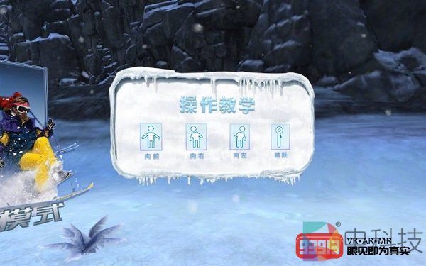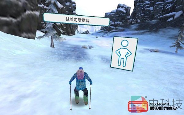如果是第一次启动游戏,则会直接进入游戏教程。本作的操作非常简单,用手柄的摆动模拟滑雪的手部动作,同时用头部控制方向。说到这里,或许你已经明白,要想在游戏中“滑”得越快,就要越快的摆动手柄。这注定是一款运动量比较大的VR游戏,而用运动的方式来玩体育游戏,其实是非常合理的设计。本作支持站姿或坐姿操作,我个人认为,如果想获得最佳的游戏体验,最好采用站姿并模拟真实滑雪的姿势(身体放低并前倾)。
