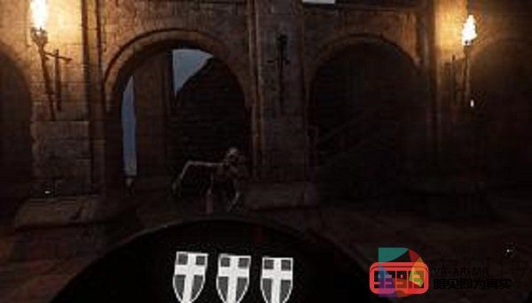 在休息了一段时间之后,我继续体验了第二款游戏《剑与魔法》,这款游戏的神奇之处就在于:我之前完全没有体验过这种类型的VR大空间游戏。在游戏中玩家可以选择战士、弓箭手和法师三种职业,然后与对手组队,共同挑战一座充满魔物的城堡。我们知道,以往的大空间VR游戏多以射击为主,而这种魔幻题材的动作游戏实在少之又少。当我和另外两名玩家共同进入游戏的时候,一种强烈的《魔兽世界》既视感马上就涌现在我脑中,这不就是下副本吗?由于我们三个人正好选择了战士、弓箭手和法师三种职业,而在我们攻略的时候,作为战士的我冲在最前方,用我的剑与盾坑住敌人的攻击,我的队友则可以从后方全力输出,这种组队配合的感觉实在太好!