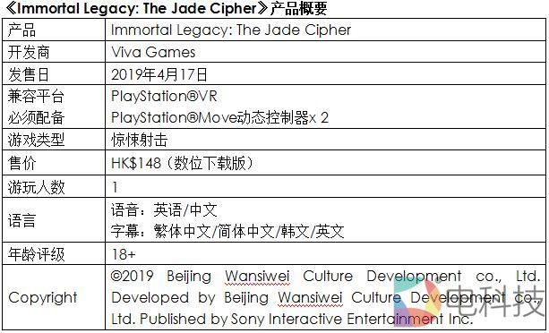 Sony Interactive Entertainment Hong Kong Limited (SIEH)宣布,于2019年4月17日发售PlayStation®VR(PS VR)专用游戏软件《Immortal Legacy: The Jade Cipher》(除